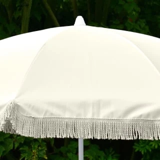 Relax in style under this fringed parasol. Powder coated steel frame. Folds away for easy storage.